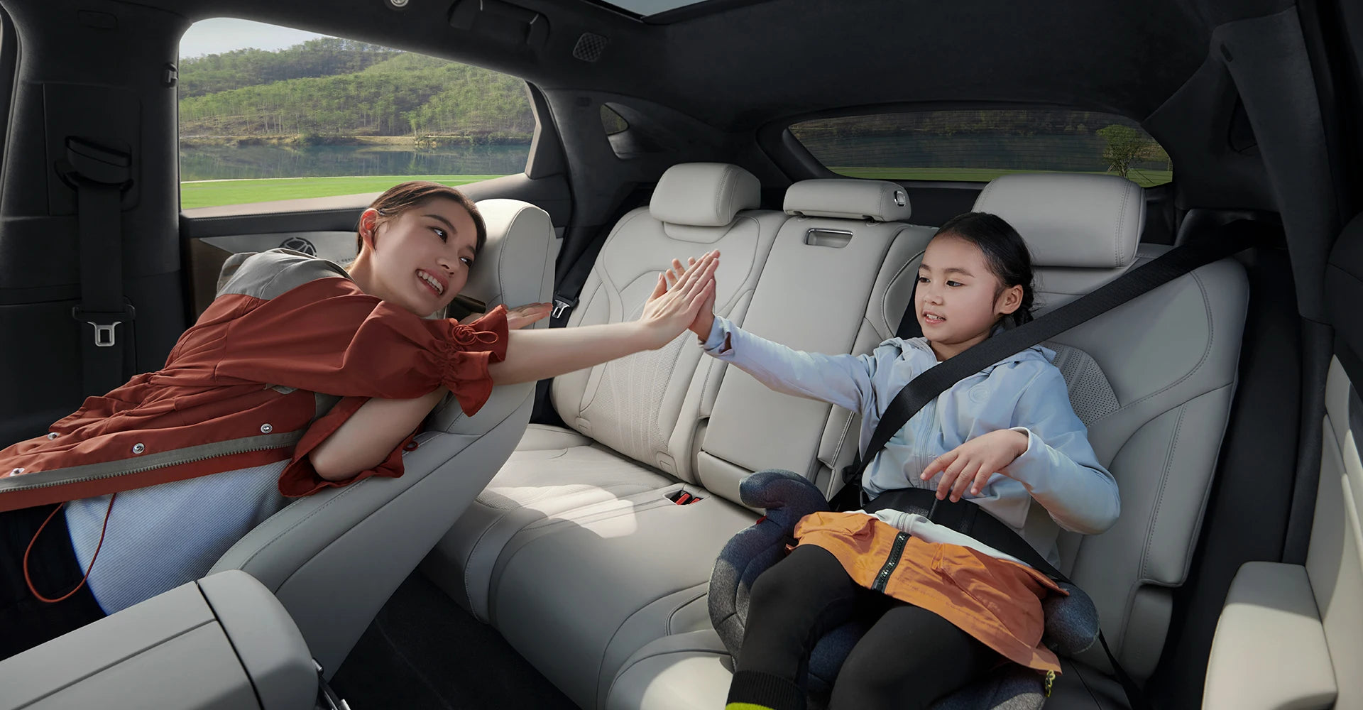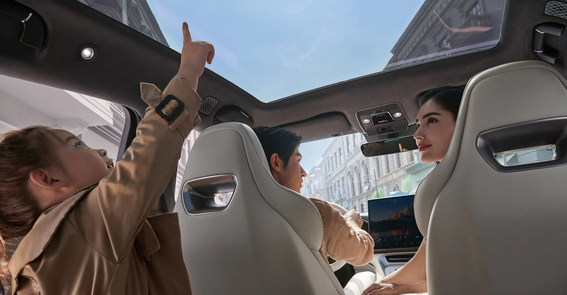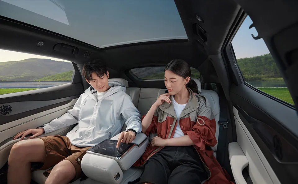 A 1.93 m² panoramic roof that blocks 99% of UV rays, filling the cabin with light while keeping it cool.